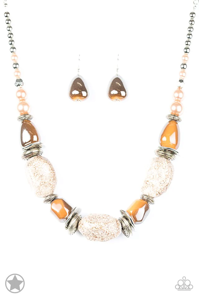 Chunky amber and peach beads with a beautiful glazed finish are complemented by large speckled faux rocks and pearly brown beads. Features an adjustable clasp closure. Sold as one individual necklace. Includes one pair of matching earrings.