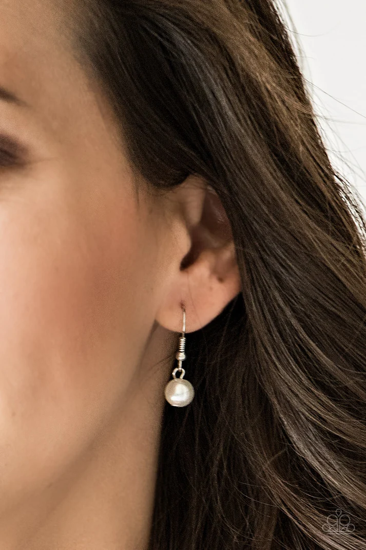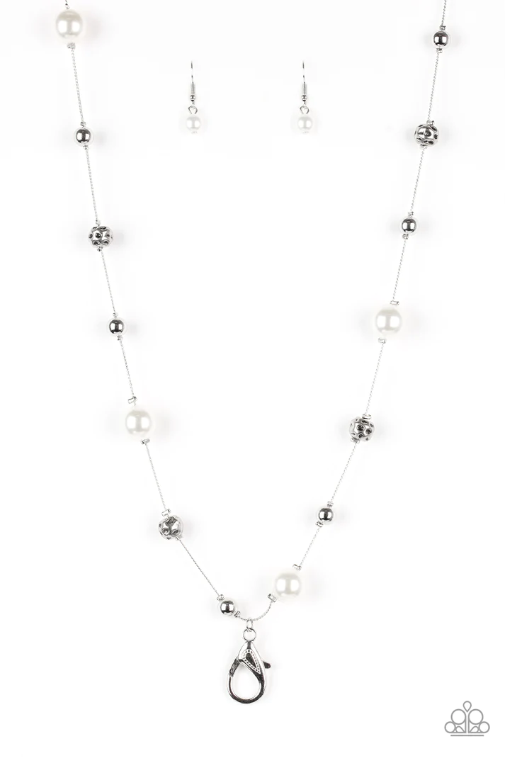 Infused with pearly white accents, classic silver and delicately hammered silver beads trickle along an elegantly elongated silver chain for a refined look. A lobster clasp hangs from the bottom of the design to allow a name badge or other item to be attached. Features an adjustable clasp closure.