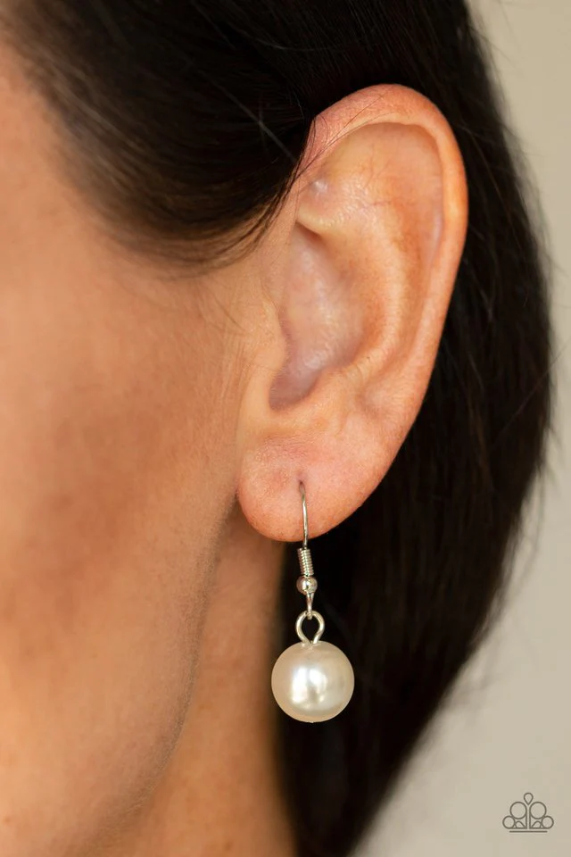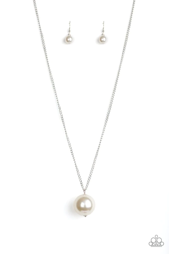 An oversized white pearl pendant swings from the bottom of a lengthened silver chain for a dramatic look. Features an adjustable clasp closure. Sold as one individual necklace. Includes one pair of matching earrings.
