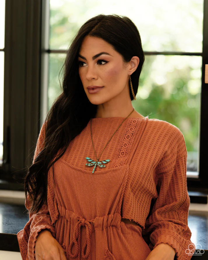 Featuring a classic brass chain, various cuts of turquoise stone are passed into an oversized, airy brass dragonfly pendant for a rustically earthy centerpiece. Features an adjustable clasp closure. As the stone elements in this piece are natural, some color variation is normal.