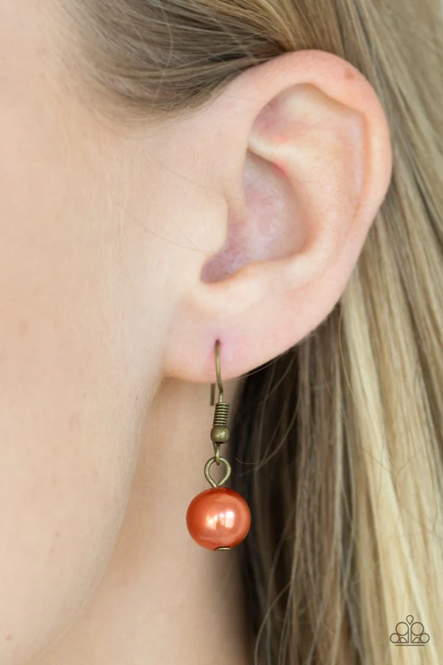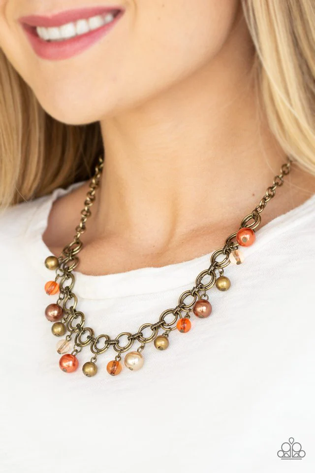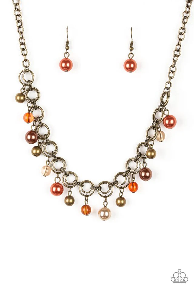 Featuring pearly and glassy finishes, an array of brass, brown, and orange beads swing from a double-linked brass chain, creating a fancy fringe below the collar. Features an adjustable clasp closure. Sold as one individual necklace. Includes one pair of matching earrings.