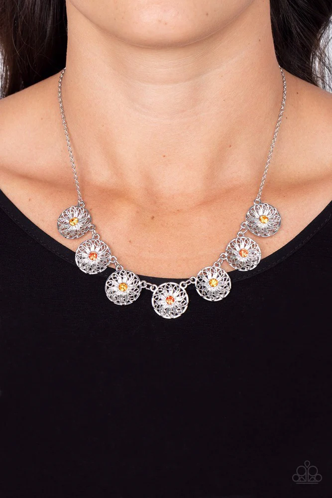 Dotted with dark and light orange rhinestone centers, decorative silver flowers bloom from circular silver frames as they link below the collar for a flirtatious floral fashion. Features an adjustable clasp closure.
