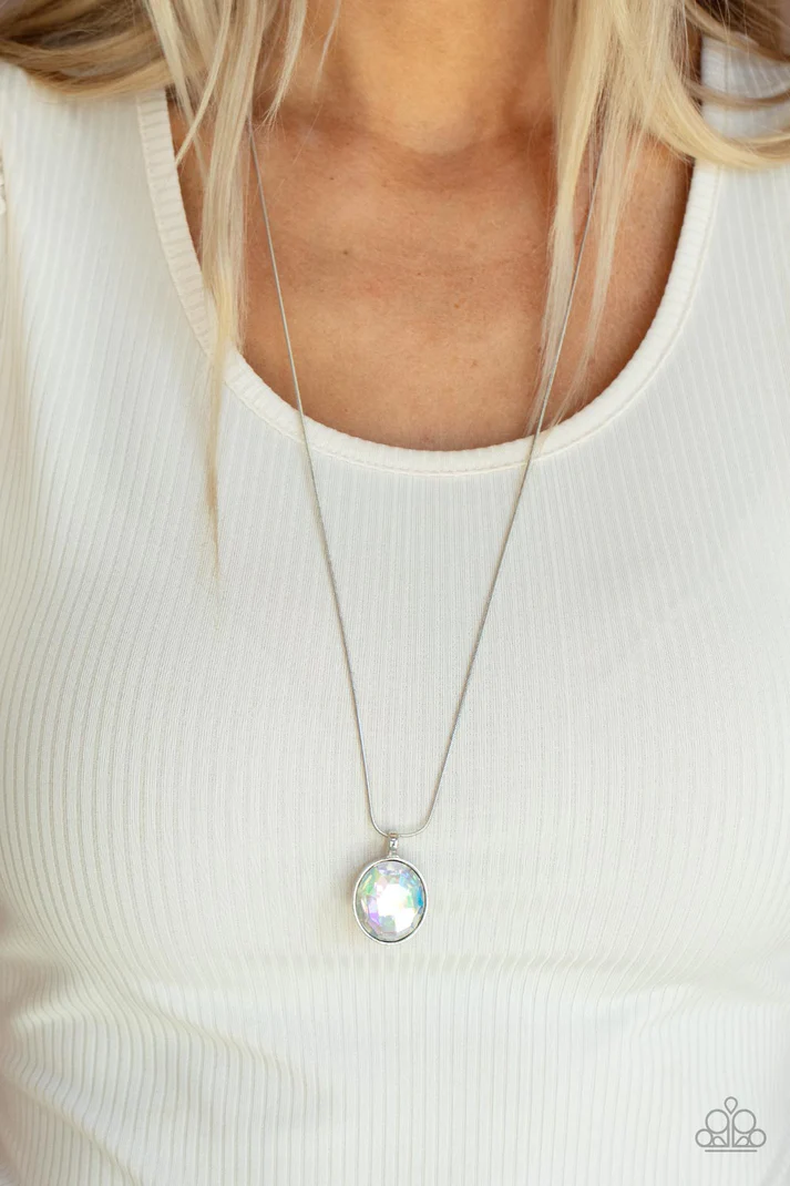 An oversized iridescent gem is pressed into the center of a sleek silver fitting, creating a mesmerizing statement piece at the bottom of a sleek silver chain. Features an adjustable clasp closure.