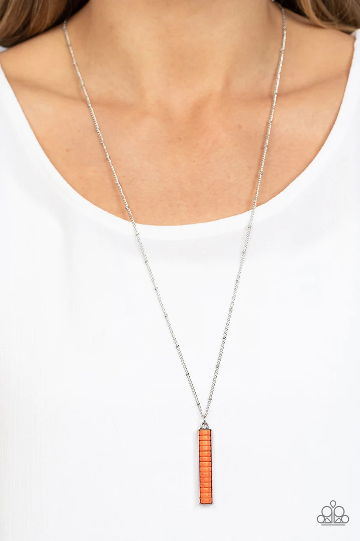 A refreshing collection of dainty orange stone discs stack inside a rectangular silver frame, creating a rustic pendant as it sways at the end of a lengthened dainty silver satellite chain. Features an adjustable clasp closure.