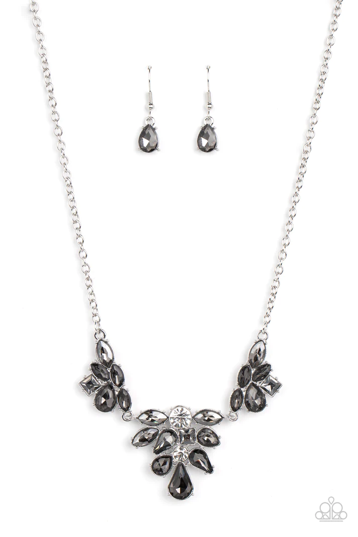 Varying in cut and shimmer, bubbly clusters of mismatched white and smoky rhinestones coalesce into three sparkly frames for a captivating statement below the collar. Features an adjustable clasp closure.