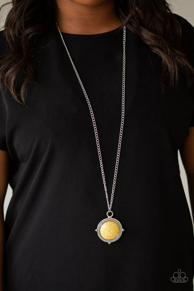 A smooth yellow stone is pressed into a shimmery silver frame radiating with metallic rope-like texture, creating a bold pendant at the bottom of a lengthened silver chain. Features an adjustable clasp closure. Sold as one individual necklace. Includes one pair of matching earrings.