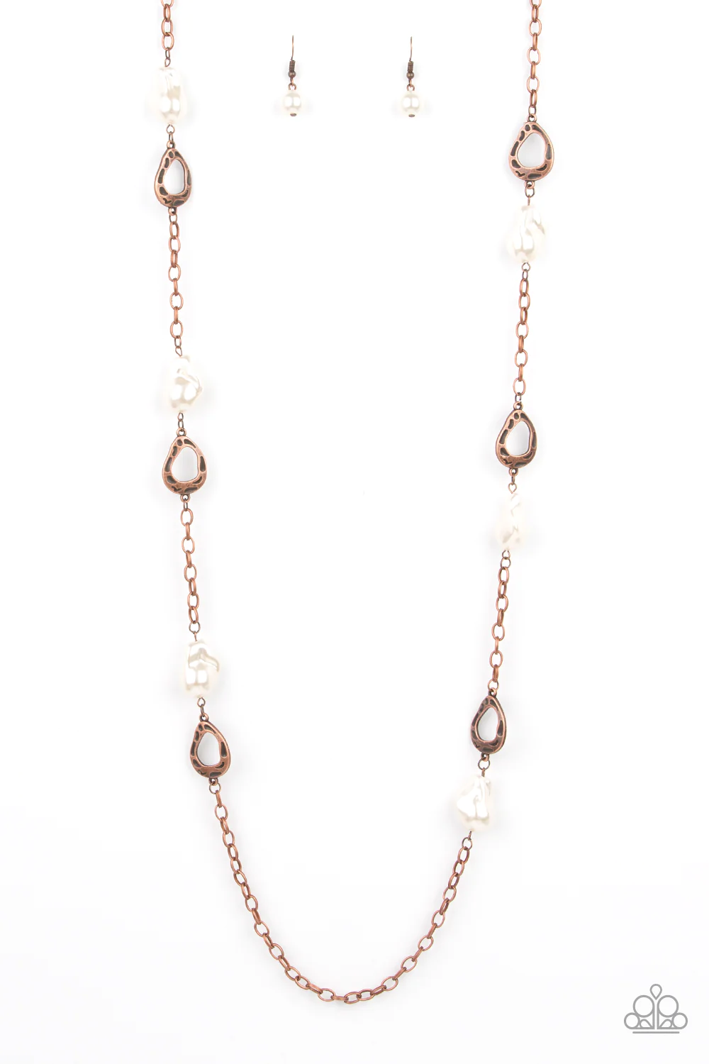 Asymmetrical hammered copper frames and imperfect pearly accents link with sections of antiqued copper chains across the chest, creating a rustic and refined statement piece. Features an adjustable clasp closure.