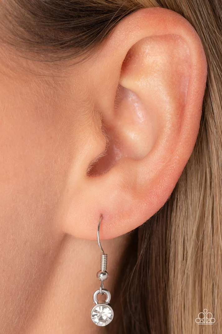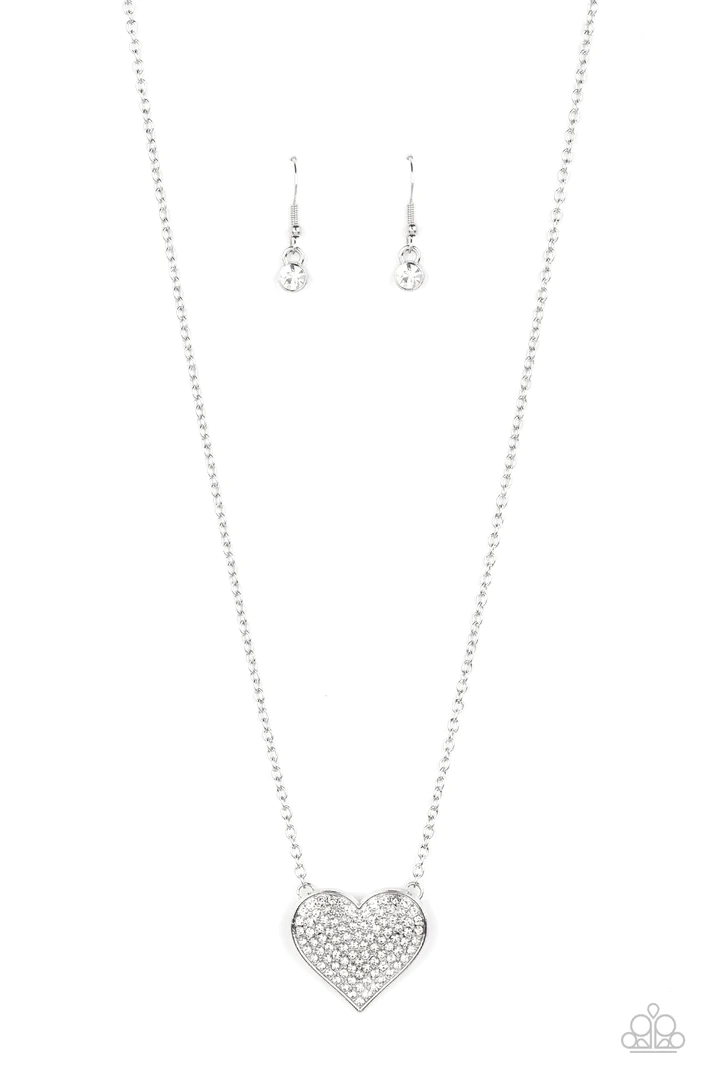 A heart-shaped pendant in a silver finish is anchored between two strands of delicate chain in the same reflective finish. The interior of the heart is filled with glittery white rhinestones, inviting onlookers to admire its unflinching sparkle. Features an adjustable clasp closure.