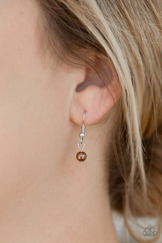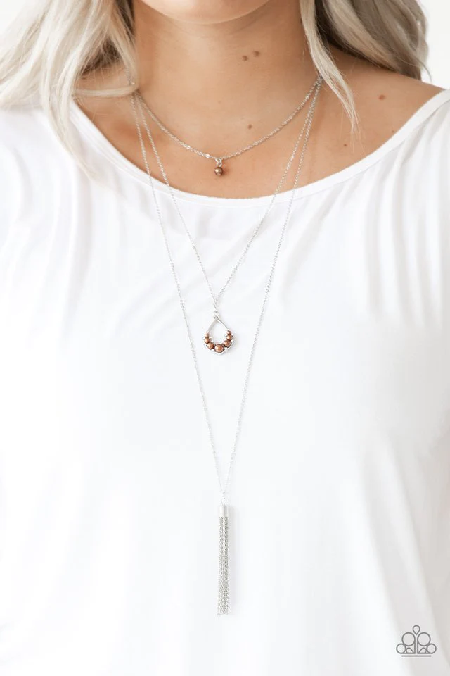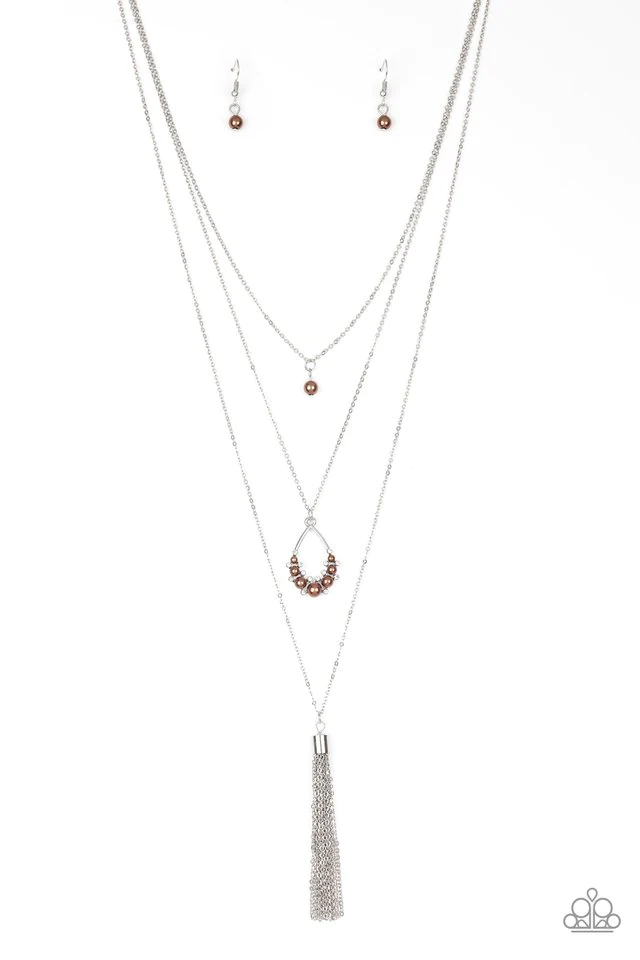 A solitaire brown pearl swings from the uppermost chain, giving way to a teardrop pendant and shimmery silver chain tassel. Dainty white rhinestones and brown pearls collect at the bottom of the centermost pendant for a glamorous finish. Features an adjustable clasp closure. Sold as one individual necklace. Includes one pair of matching earrings.