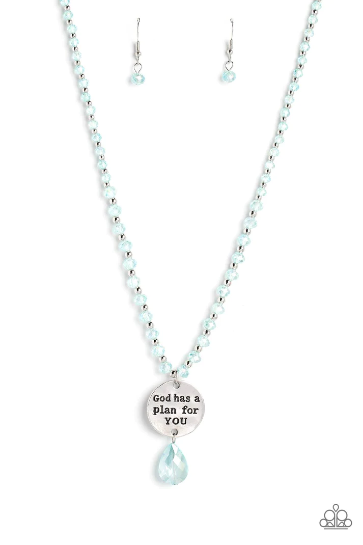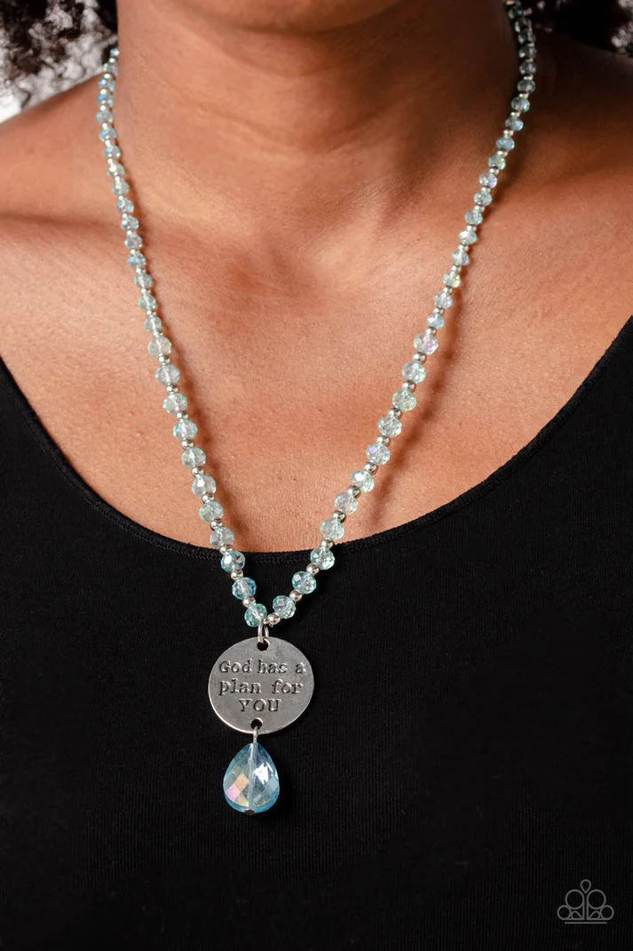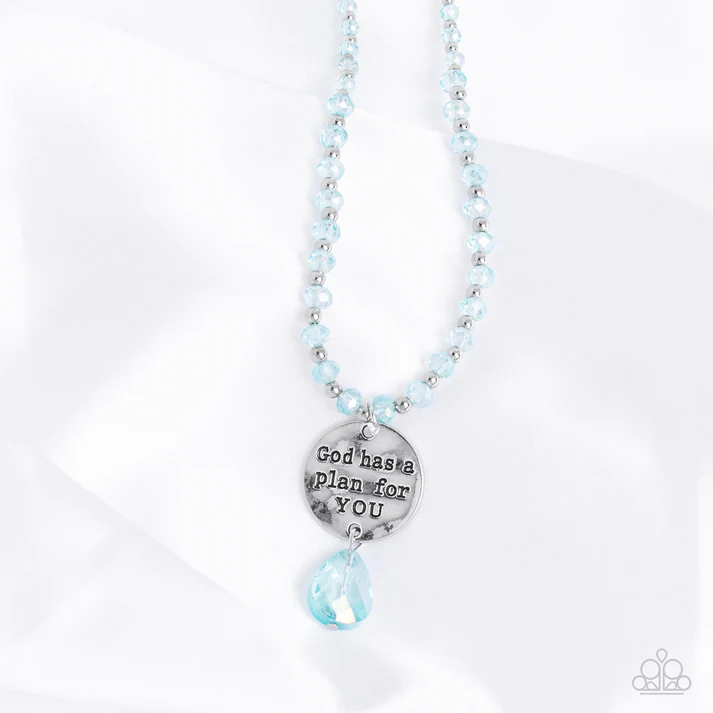 Infused along an invisible wire, silver studs and reflective light blue, faceted beads glide down the chest in a shimmery style. Hanging from the bottom of the beads and studs, a hammered silver disc is stamped with the blue faceted teardrop bead adding additional swing to the divine design. Features an adjustable clasp closure.