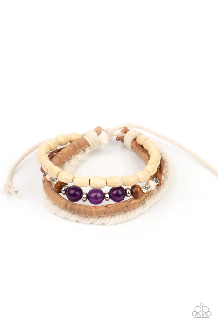 Featuring cork, thread, and wood, mismatched metallic accents, glassy purple stones, and wood beads adorn earthy layers around the wrist for a whimsical look. Features an adjustable sliding knot closure.