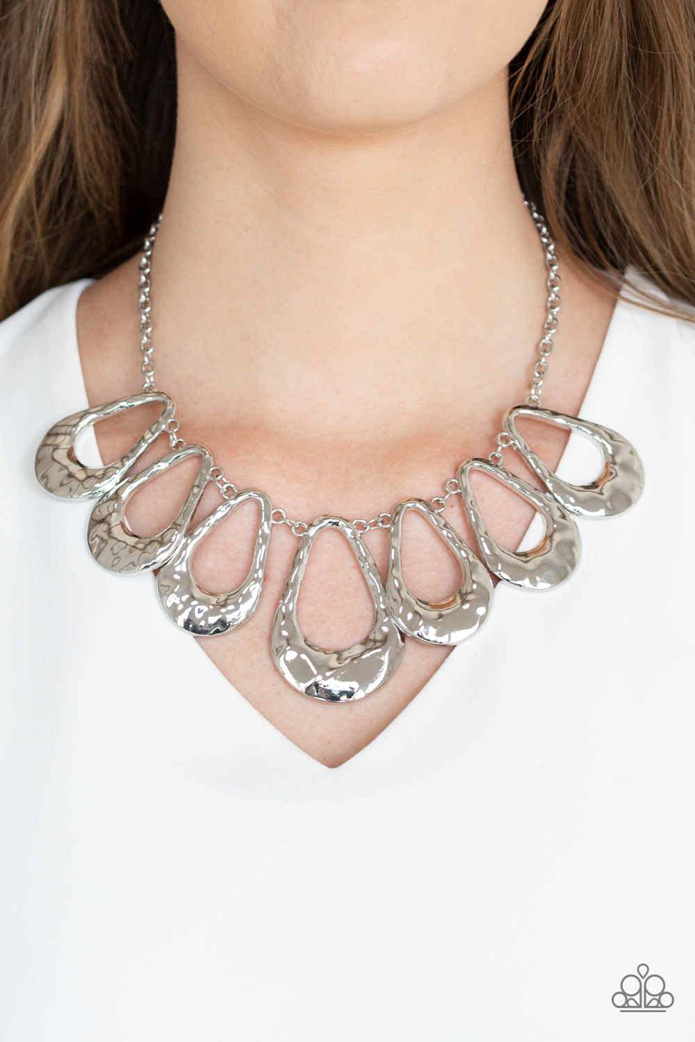 Delicately hammered in shimmer, a collection of shiny silver teardrops link below the collar for an edgy statement-making look. Features an adjustable clasp closure.