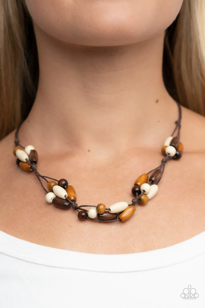 Mismatched clusters of brown, white, and dark brown wooden beads are knotted in place along shiny brown cords below the collar for an earthy flair. Features a button loop closure.