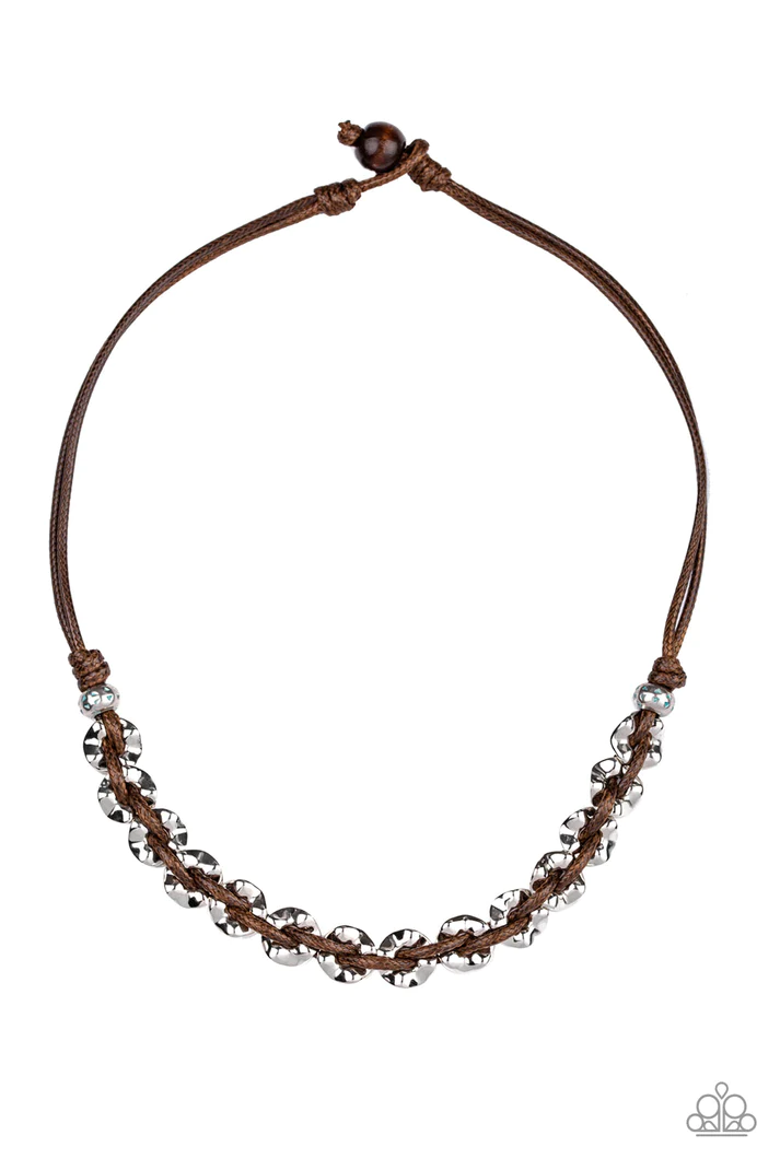 Shiny brown cording weaves through hammered silver beads below the collar for an urban look. Features a button loop closure.
