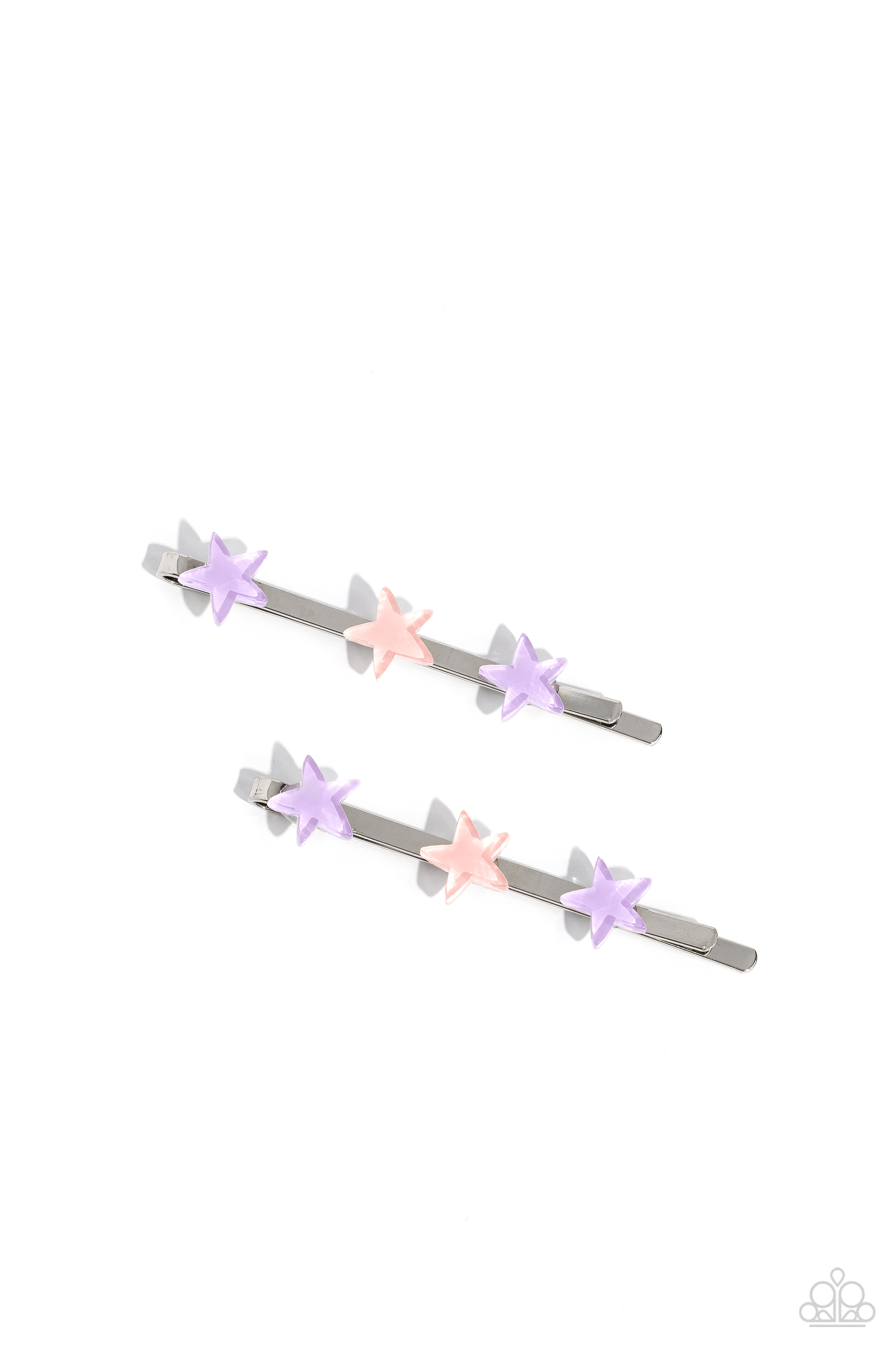 Glassy trios of pink and purple stars adorn the fronts of two classic silver bobby pins, creating a stellar duo.