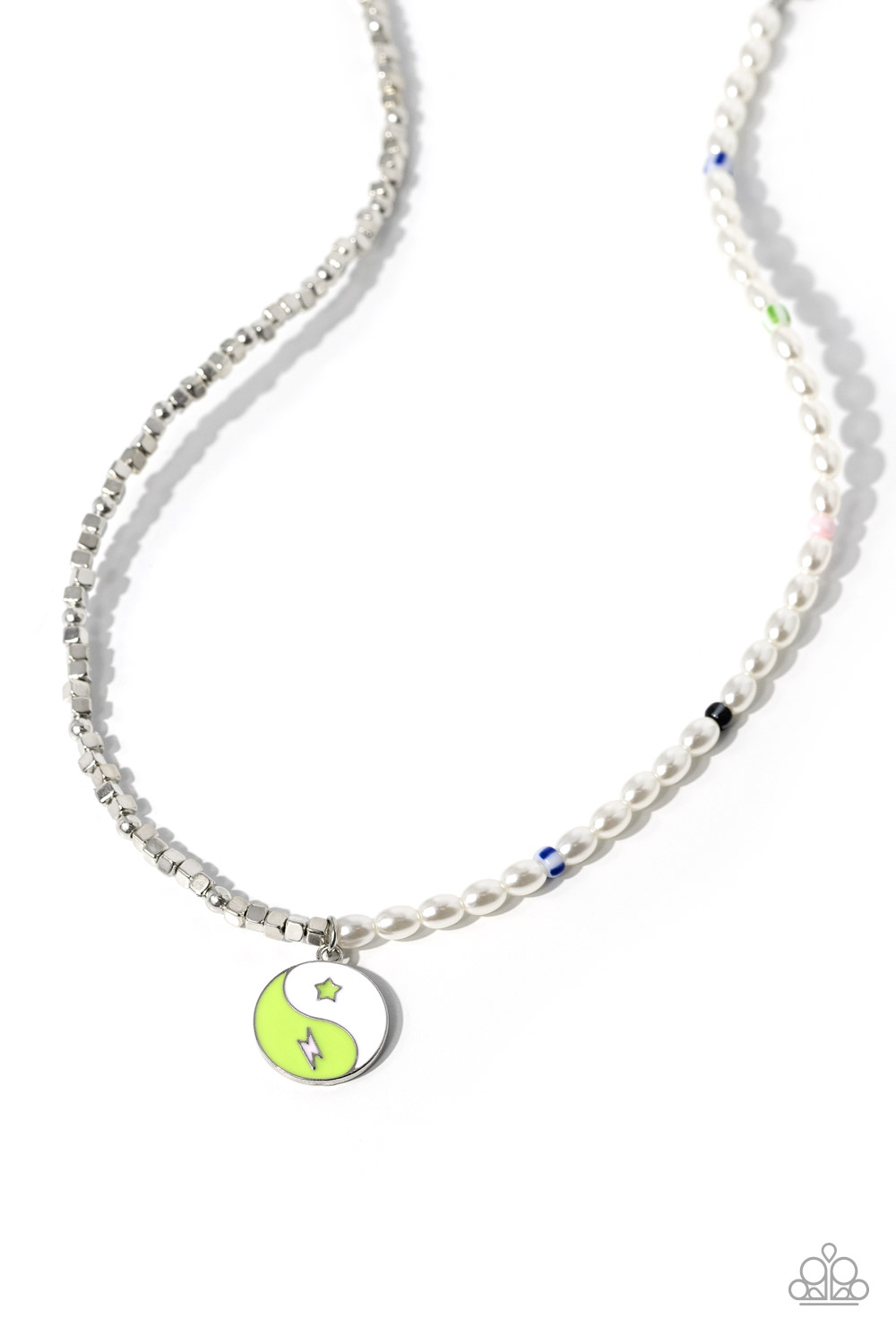 A strand of oval white pearls, sporadically infused with multicolored-striped beads, collides with cubed silver beads and studs to create an abstract blend of elegance and sheen. A yin-yang charm featuring white and Kohlrabi accents and star and lightning bolt symbols dangles from the bottom of the contrasting design for the perfect balance of color. Features an adjustable clasp closure.
