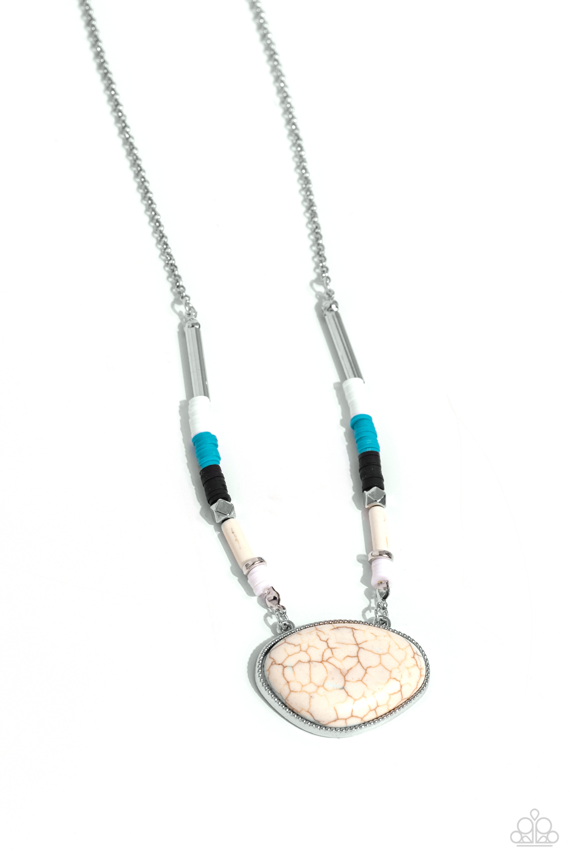 A collection of turquoise, white, and black clay discs and silver accents are infused along an invisible string that connects to a classic silver chain. A white stone in a studded silver frame dangles from the colorful strand for an earthy finish. Features an adjustable clasp closure. As the stone elements in this piece are natural, some color variation is normal.