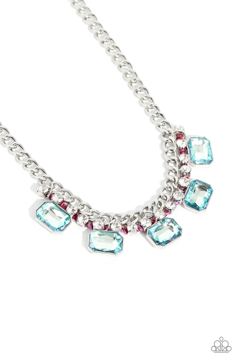 Brushed in a high-sheen finish, a strand of flat silver curb chain dramatically drapes across the chest for a bold industrial look. A row of faceted light blue emerald-cut gems cascade from the bottom of a strand of glittery white rhinestones set in silver square fittings and ornately woven in Viva Magenta and purple cording for a modern look. Features an adjustable clasp closure.