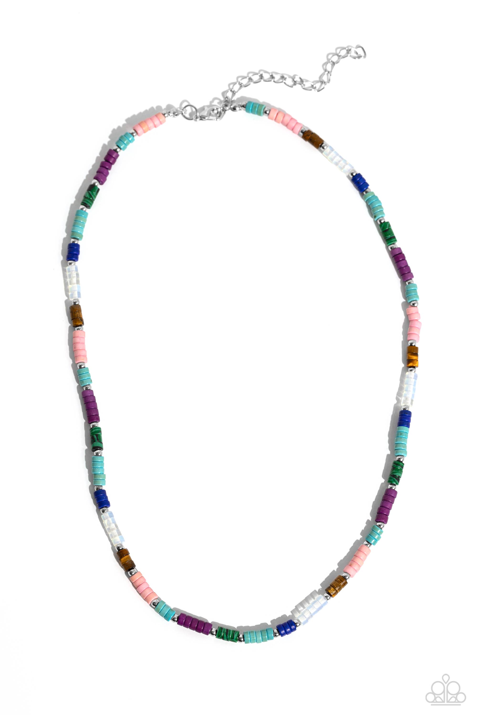 Infused with dainty silver accents, multicolored stone discs are threaded along an invisible wire below the collar creating a natural pop of seasonal inspiration. Features an adjustable clasp closure. As the stone elements in this piece are natural, some color variation is normal.