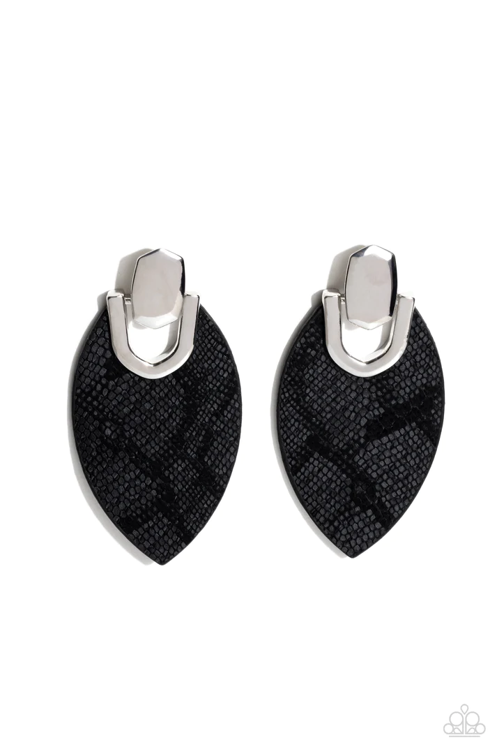Featuring python-like texture, an oval black leather frame attaches to a bold silver fitting, creating a wild lure. Earring attaches to a standard post fitting.