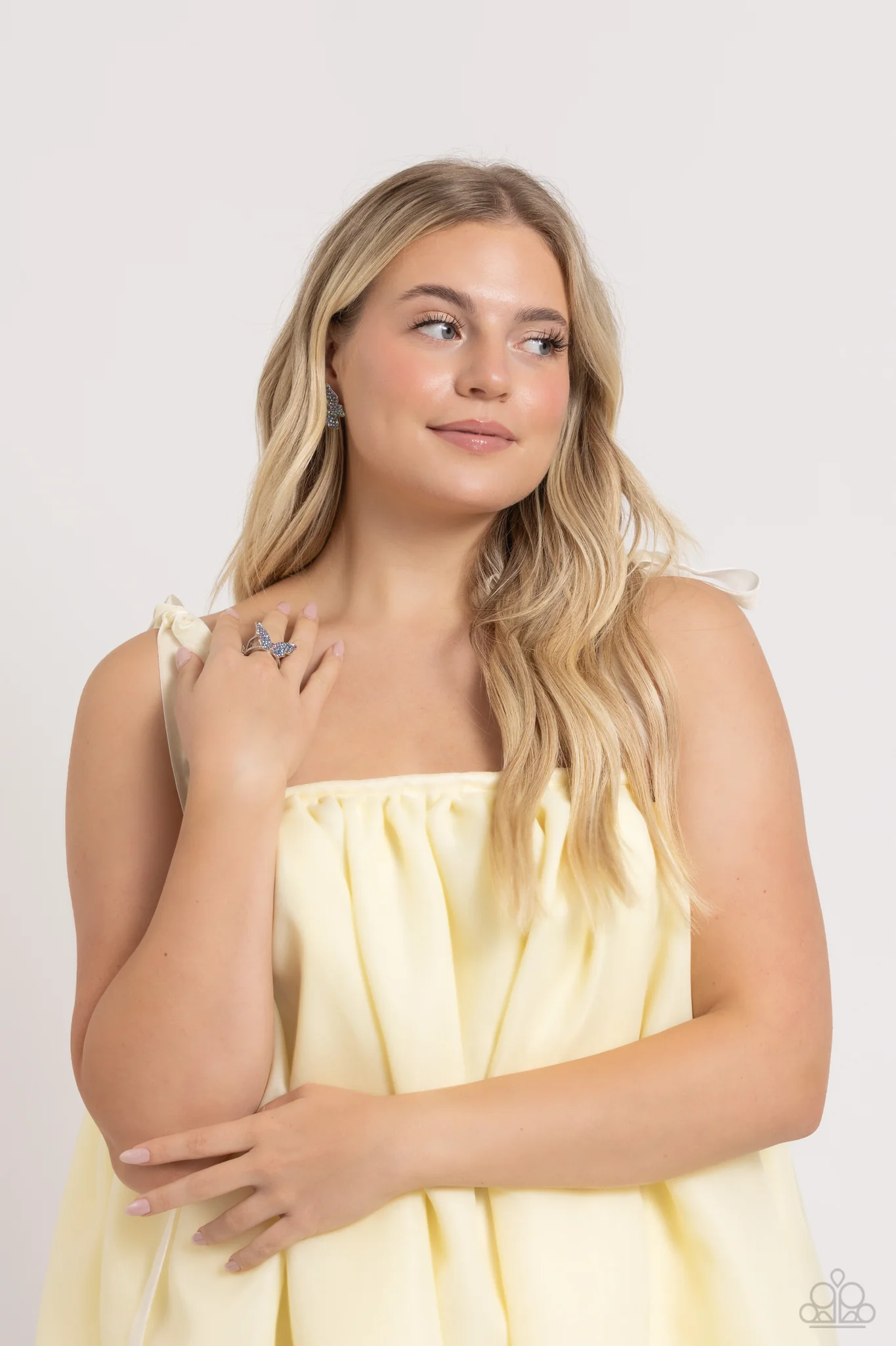 Featuring a tilted motif, a silver butterfly encrusted with an explosion of blue iridescent rhinestones sparkles at the ear for an enchanting fashion. Earring attaches to a standard post fitting. Due to its prismatic palette, color may vary.