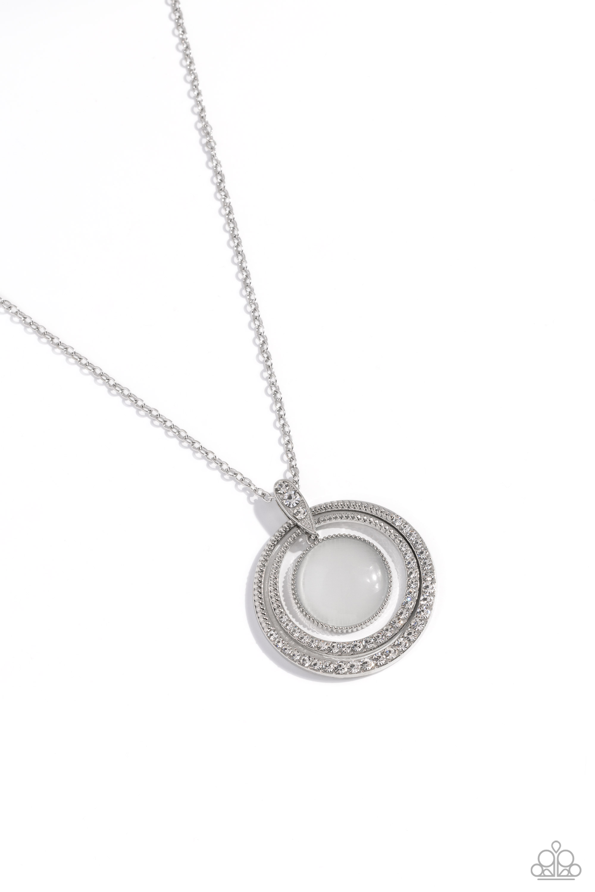 Dangling from a classic silver chain, two airy silver hoops are threaded through an exaggerated, rhinestone-encrusted clasp. The silver hoops feature sections of texture and a row of white rhinestones that increase in size as they line the hoop's edge. An oversized, white, cat's eye stone hangs from the clasp; suspended inside the silver hoops, where its glassy surface shimmers gracefully. Features an adjustable clasp closure.