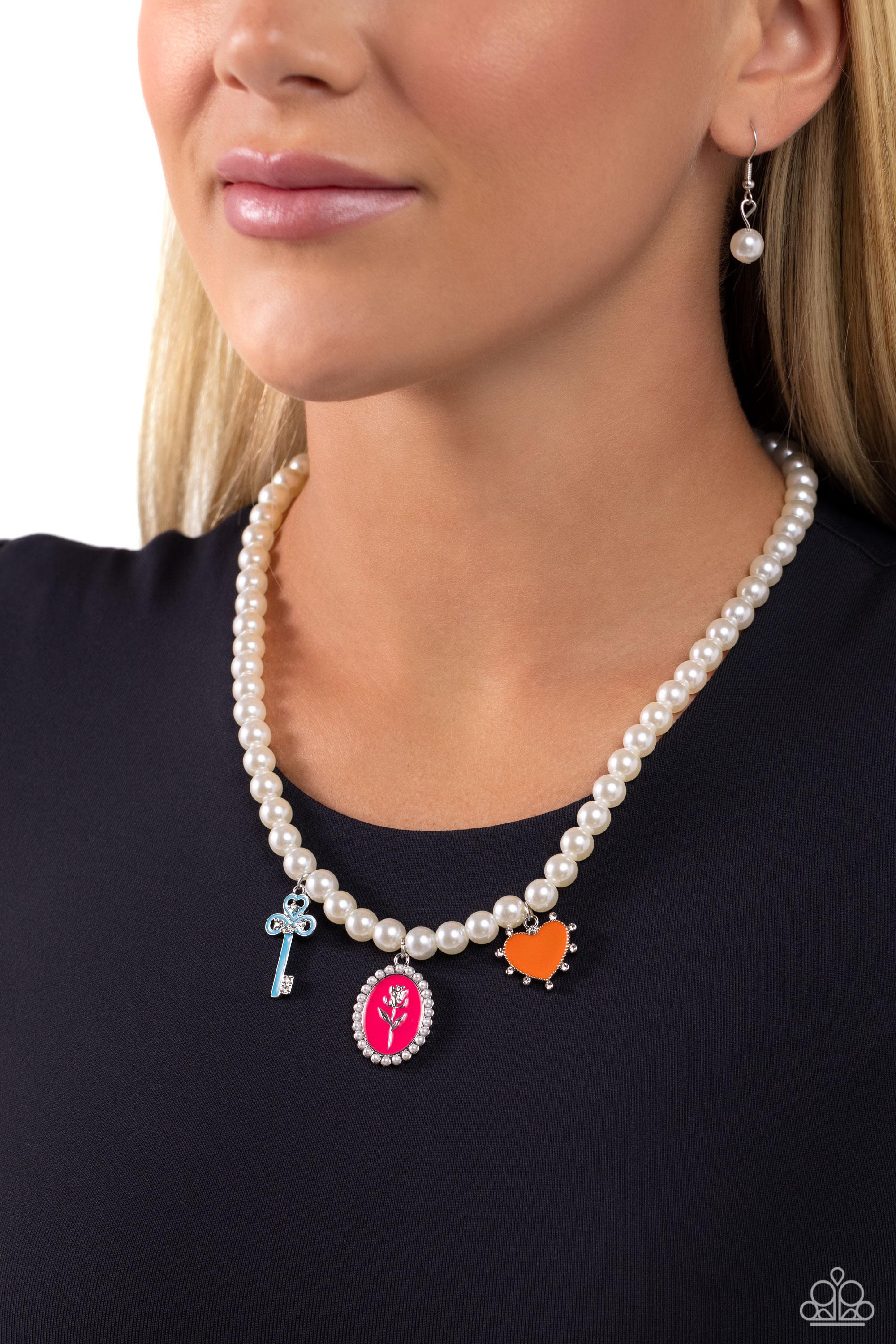 Infused along an invisible string, a collection of gleaming white pearls coalesces below the collar for a refined display. Featuring white rhinestones and dainty pearl accents, three Pink Peacock, orange, and blue painted charms, including a key, rose pendant, and studded heart, dangle below the pearly display for a girly pop of color. Features an adjustable clasp closure.