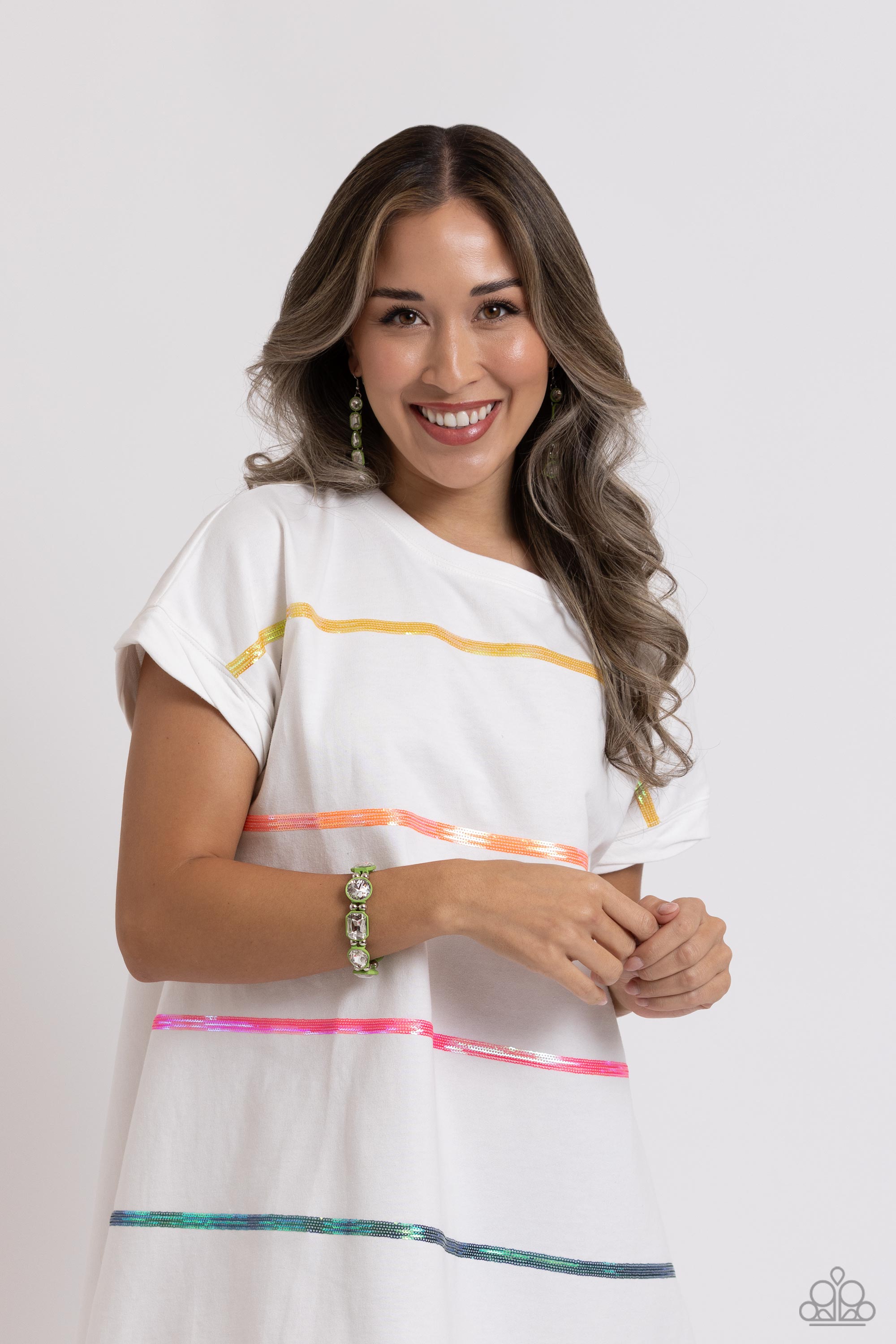 Featuring Kohlrabi rubber-like frames, a glassy collection of white round, teardrop, hexagonal, and emerald-cut gems trickle from the ear for a shoulder-dusting fashion. Earring attaches to a standard fishhook fitting.