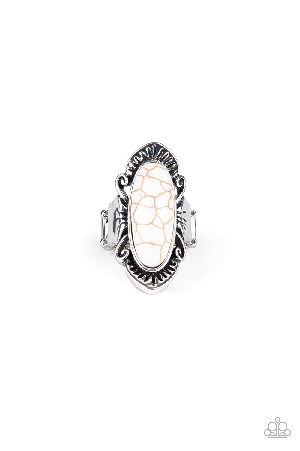 An oval white stone is nestled atop an antiqued silver frame etched with ornate detail, creating a decorative artisan inspired piece atop the finger. Features a stretchy band for a flexible fit.