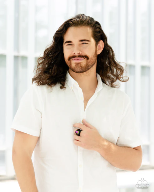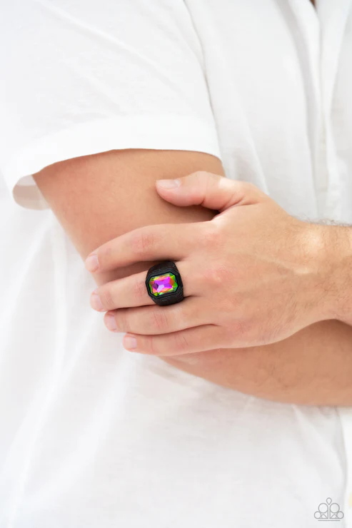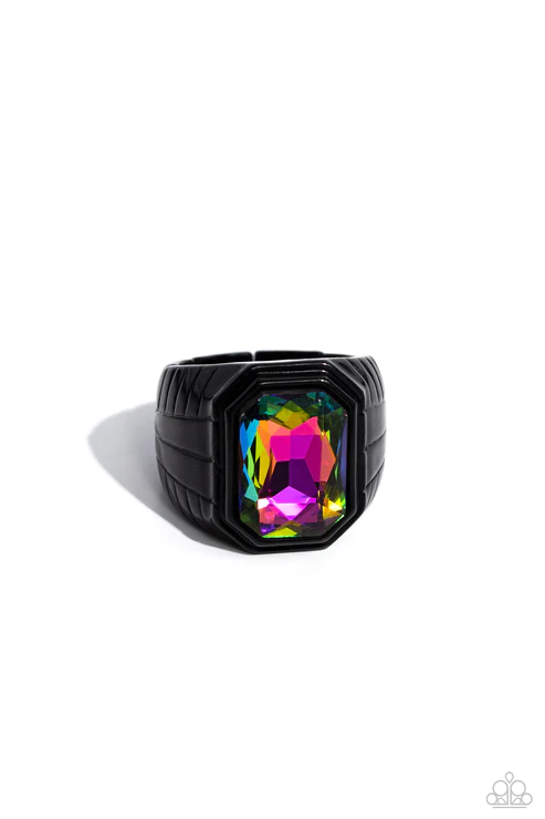 Featuring a regal emerald style cut, a glittery oil spill gem is pressed into a sleek black frame featuring a thick black band embossed in bold textures. Features a stretchy band for a flexible fit.