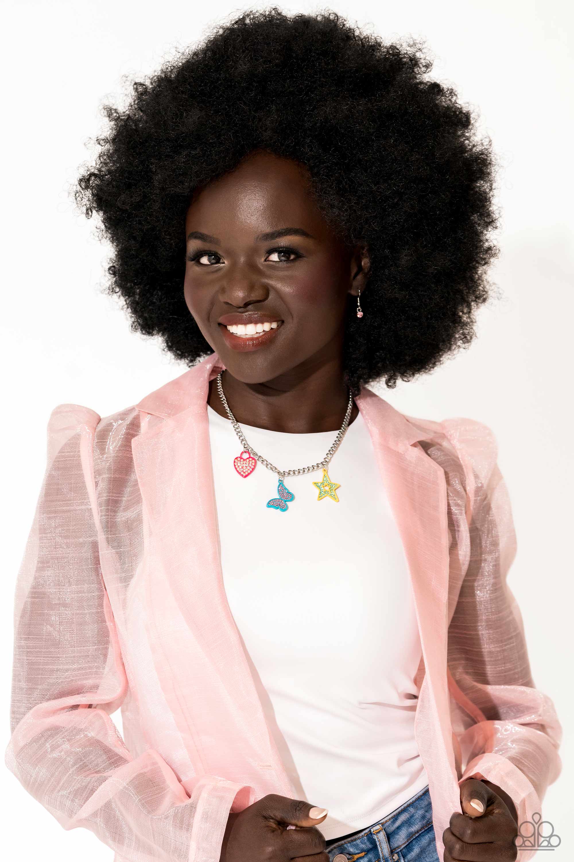 Swinging along a classic silver chain, a High Visibility painted star, turquoise painted butterfly, and Pink Peacock painted heart dance along the chest for a sensational statement. Each shape is encrusted in aquamarine, light rose, and iridescent rhinestones for a simple touch of shimmer. Features an adjustable clasp closure. Due to its prismatic palette, color may vary.