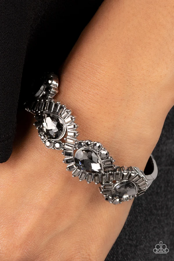 Ribbons of emerald and round cut hematite loop around dramatically oversized hematite teardrop rhinestones, resulting in an explosion of sparkle across the front of a silver bangle-like bracelet. Features a hinged closure.