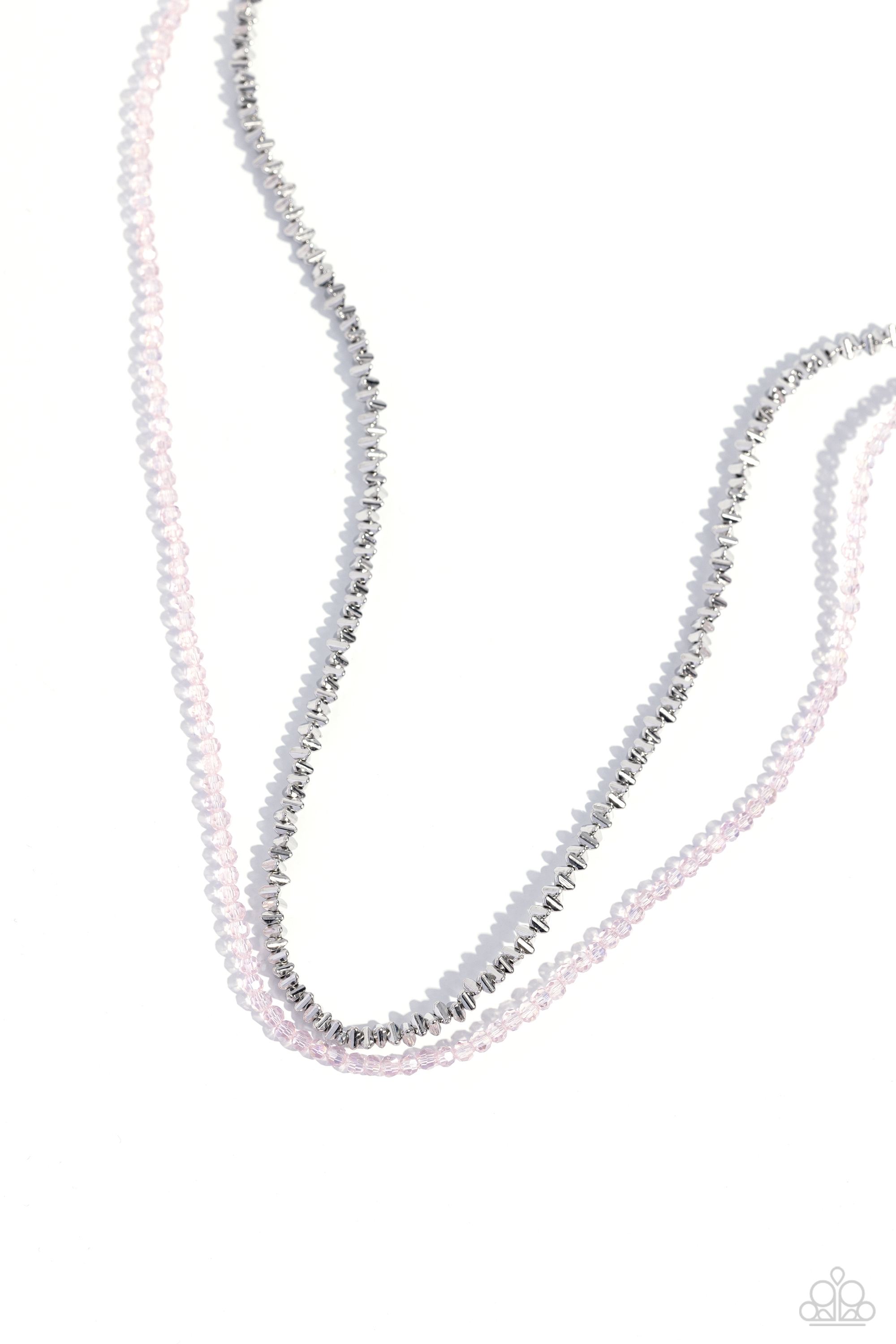 A strand of chiseled silver beads layers beside a faceted collection of pink beads for a girly display. Features an adjustable clasp closure.