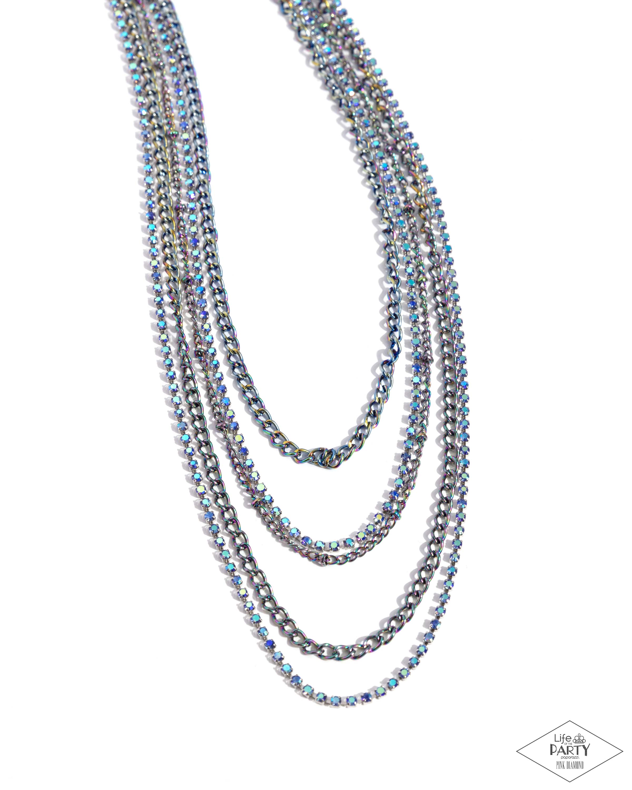 Dainty rows of classic oil spill chains, oil spill satellite chains, and strands of glassy blue iridescent rhinestones, create dazzling layers around the neck. Features an adjustable clasp closure. Due to its prismatic palette, color may vary.
