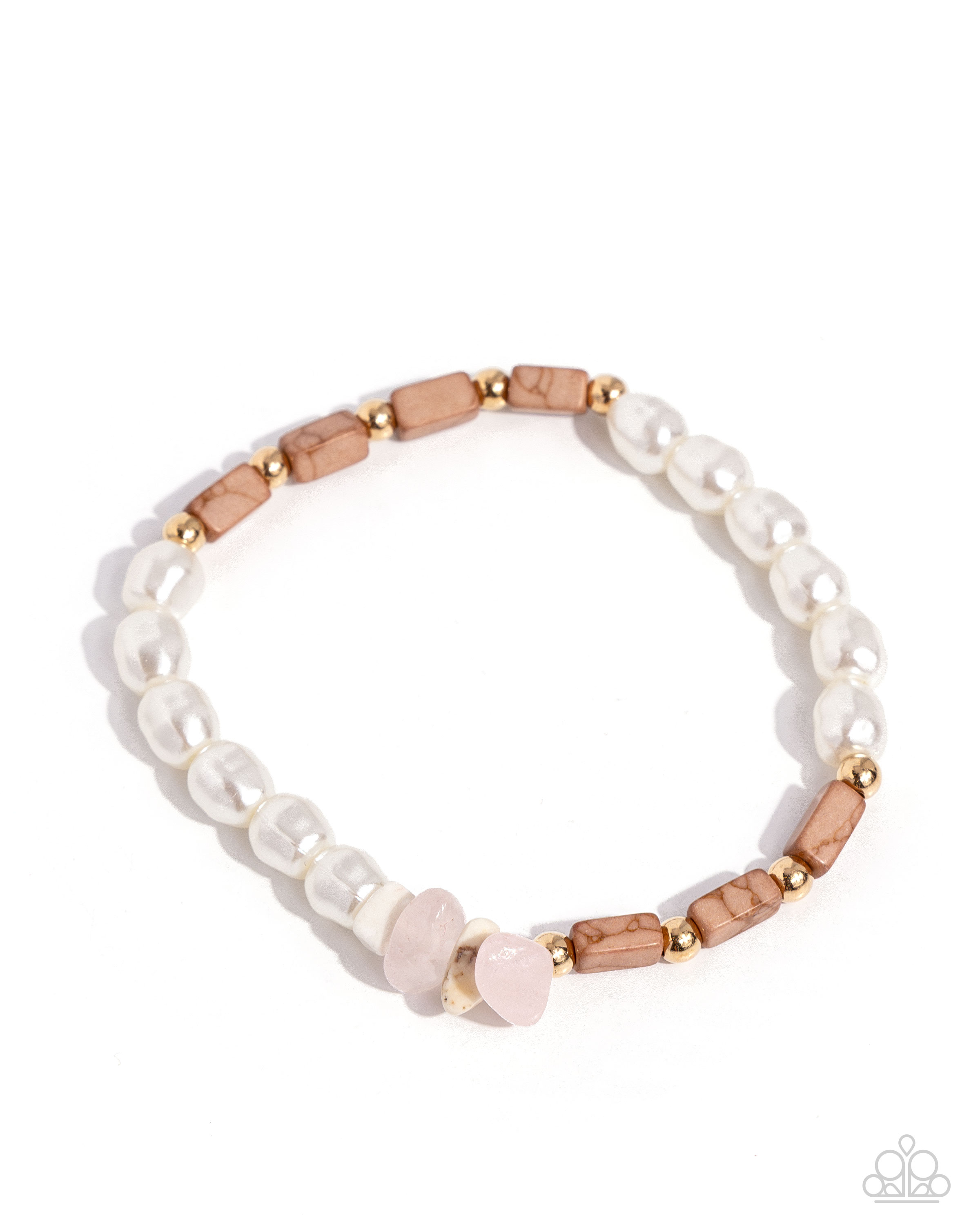 Infused along an elastic stretchy band a collection of ivory seed beads, white pearls, gold beads, and pink and white stones coalesce around the wrist. Marbled Brush stones are added along the design for additional color and wild interest. As the stone elements in this piece are natural, some color variation is normal.