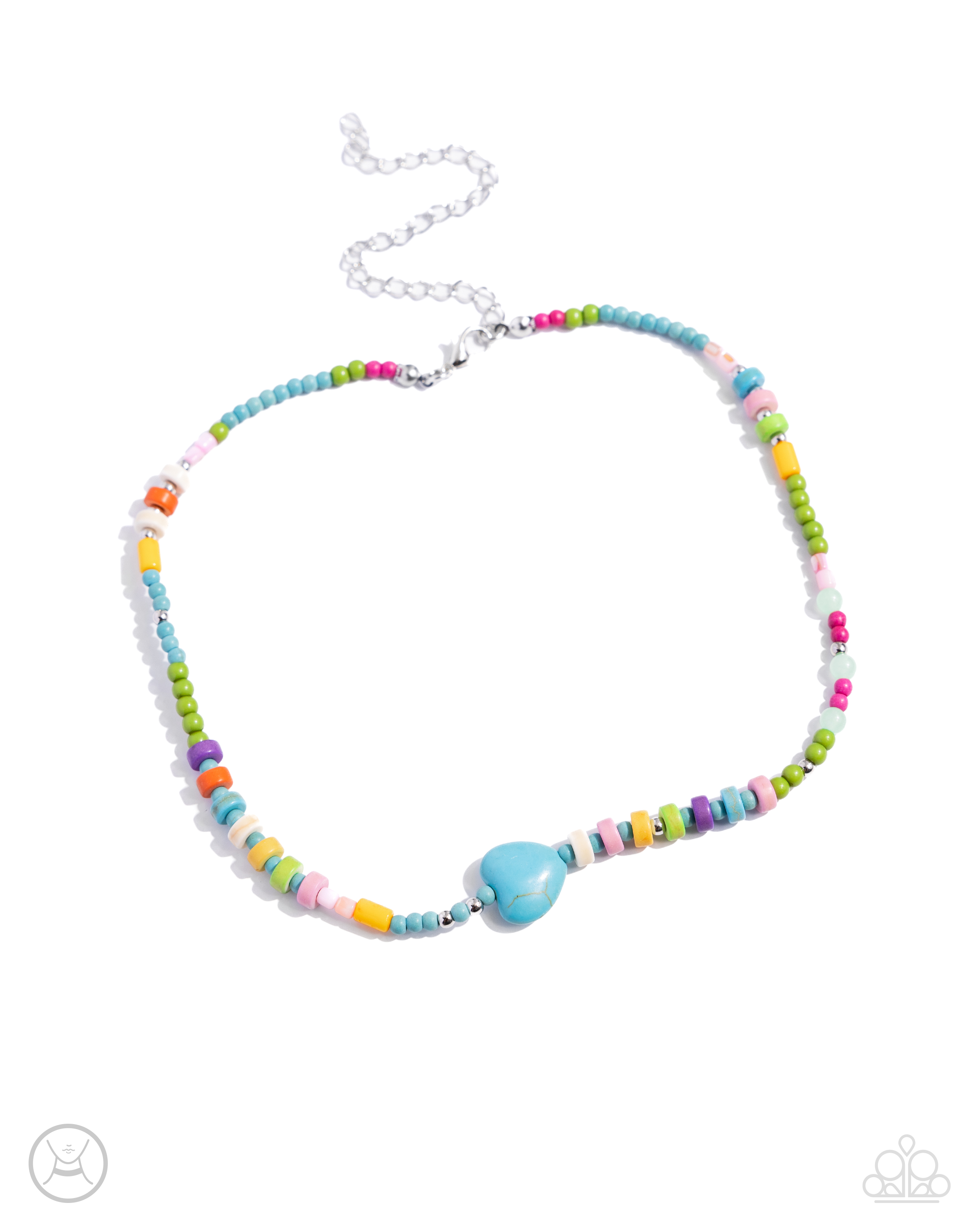 Infused along an invisible string, a collection of silver beads, multicolored stone beads, multicolored acrylic discs, and a turquoise stone heart loop around the collar for a trendy display. Features an adjustable clasp closure. As the stone elements in this piece are natural, some color variation is normal.