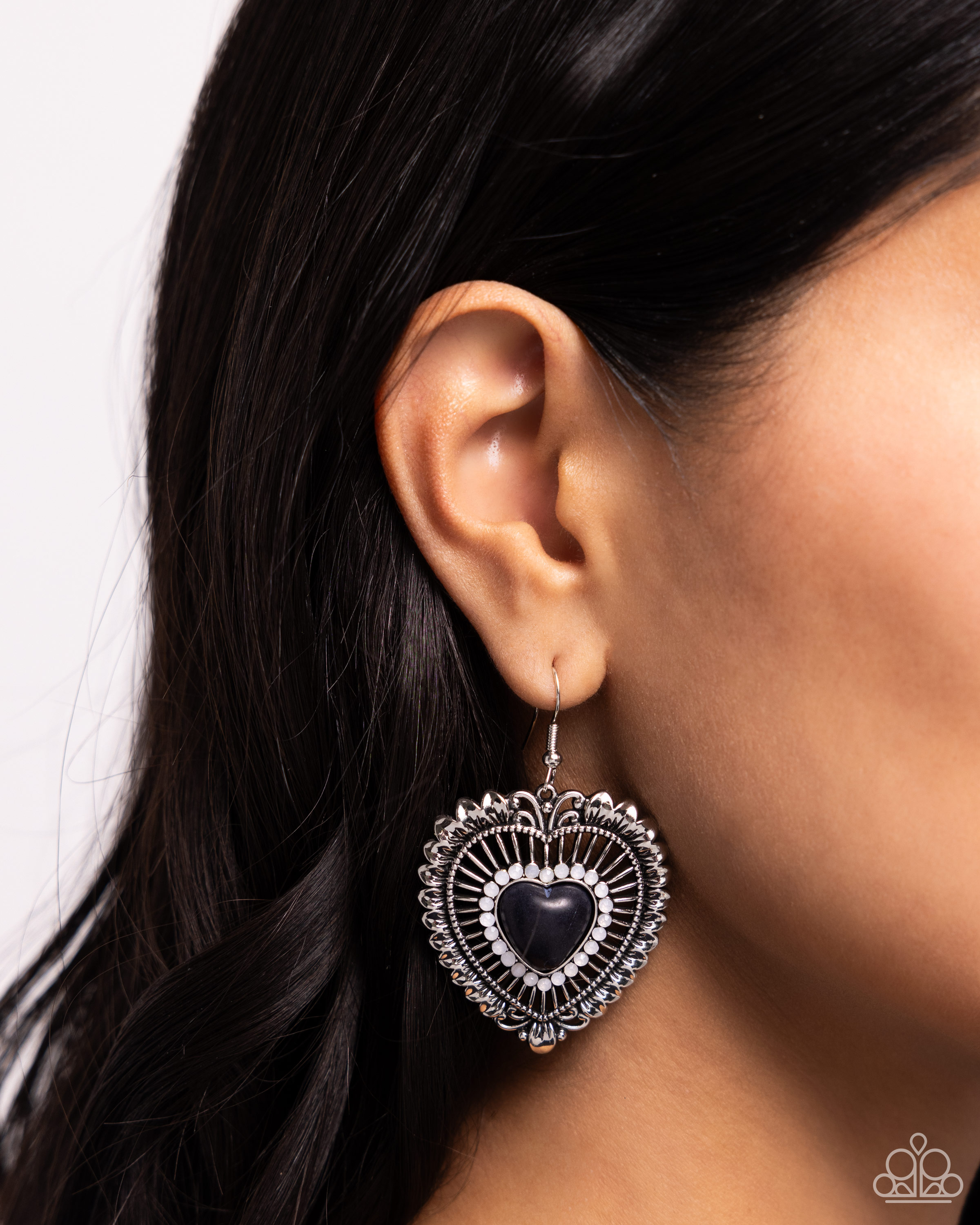 Bordered by a collection of dainty opalescent gems, a black stone-centered heart dangles from the ear. Airy silver filigree bursts around the dainty stone heart center for additional texture and detail. Earring attaches to a standard fishhook fitting. As the stone elements in this piece are natural, some color variation is normal.