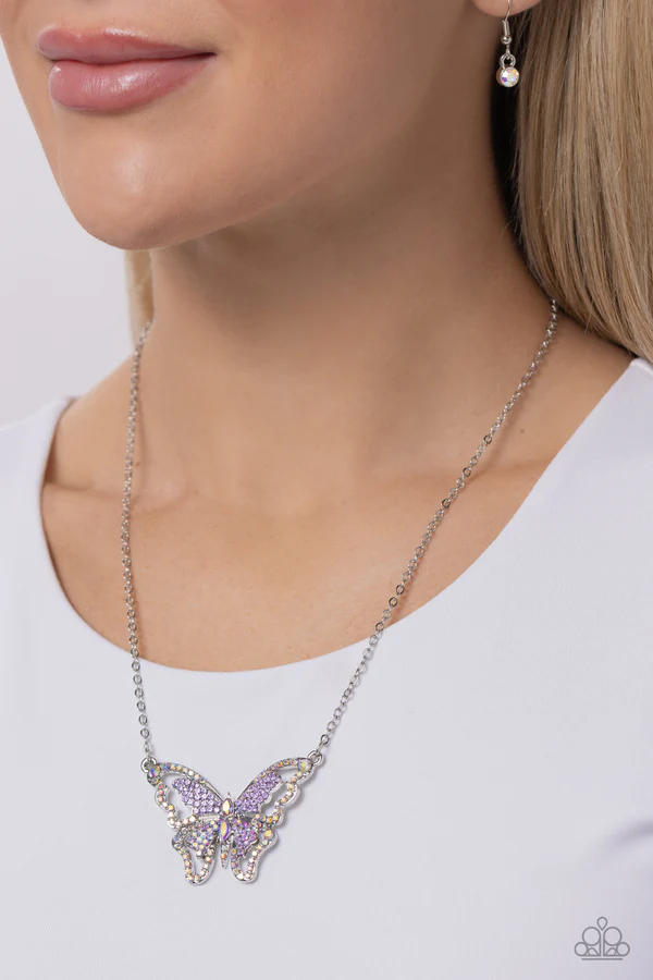 Bordered in glassy iridescent rhinestones, an airy, oversized silver butterfly is dotted in dainty iridescent and purple rhinestones in various cuts as it flutters from a silver chain below the collar for an enchanting fashion. Features an adjustable clasp closure. Due to its prismatic palette, color may vary.