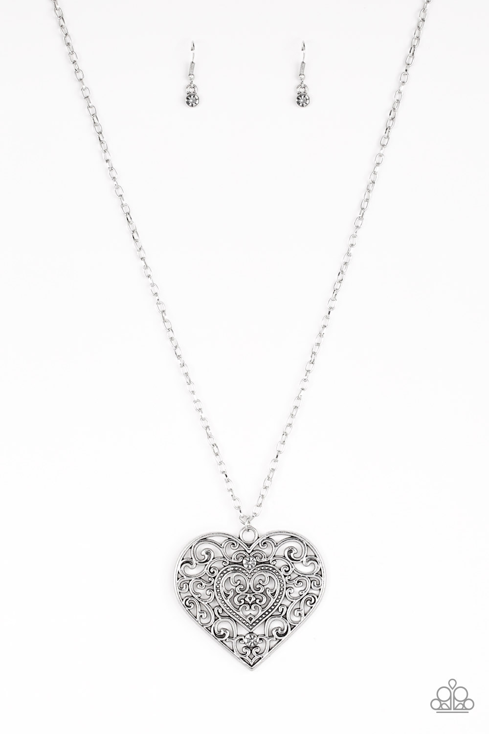 Dotted with smoky rhinestones, an oversized heart frame radiating with glistening filigree detail swings from the bottom of a lengthened silver chain for a vintage inspired look. Features an adjustable clasp closure.