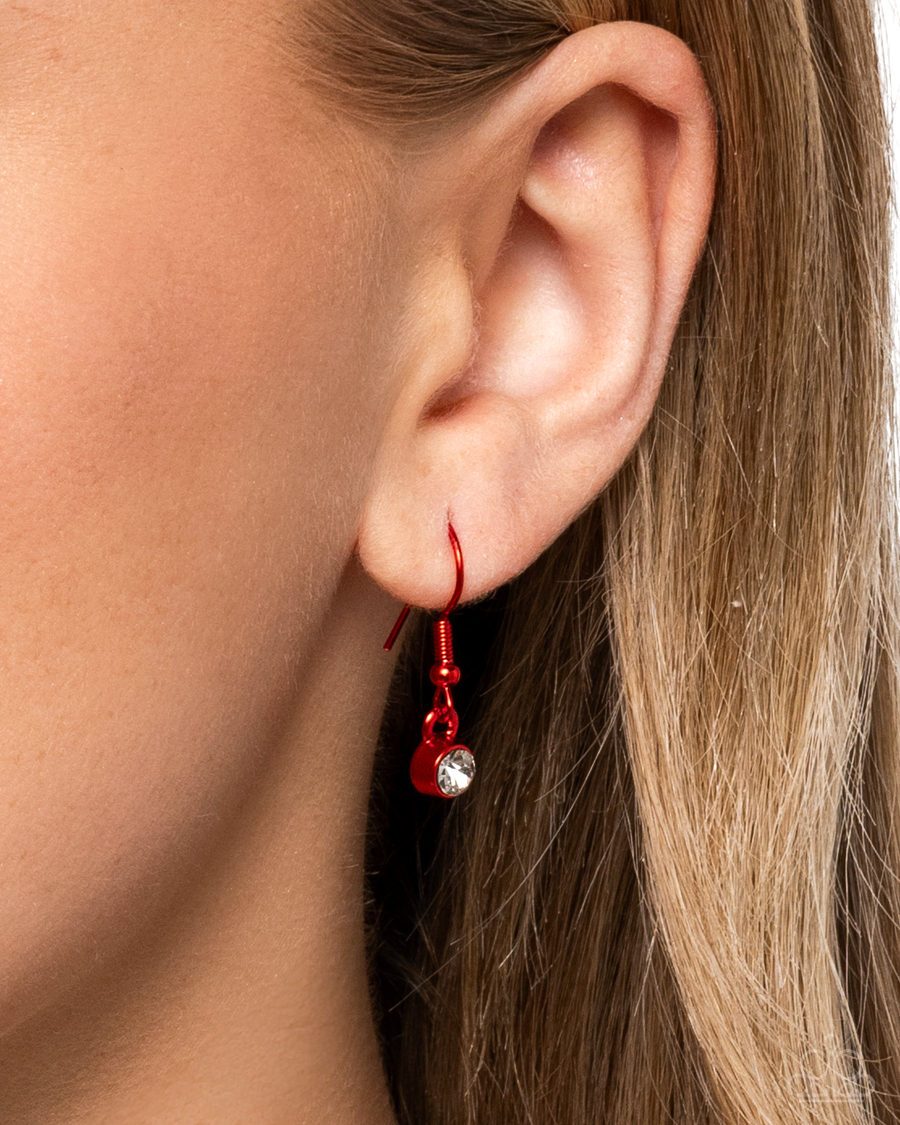 Dipped in a vibrant red hue, a red bow embellished with glistening white rhinestones curls and loops below the neckline, featuring tapered ribbon-like ends that are also adorned in glistening white rhinestones that gradually increase in size for a radiantly refined look. Features an adjustable clasp closure.