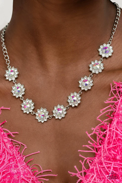 Shiny white rhinestone petals bloom from a shimmery iridescent center, creating a whimsical floral arrangement below the collar. Due to its prismatic palette, color may vary. Features an adjustable clasp closure.
