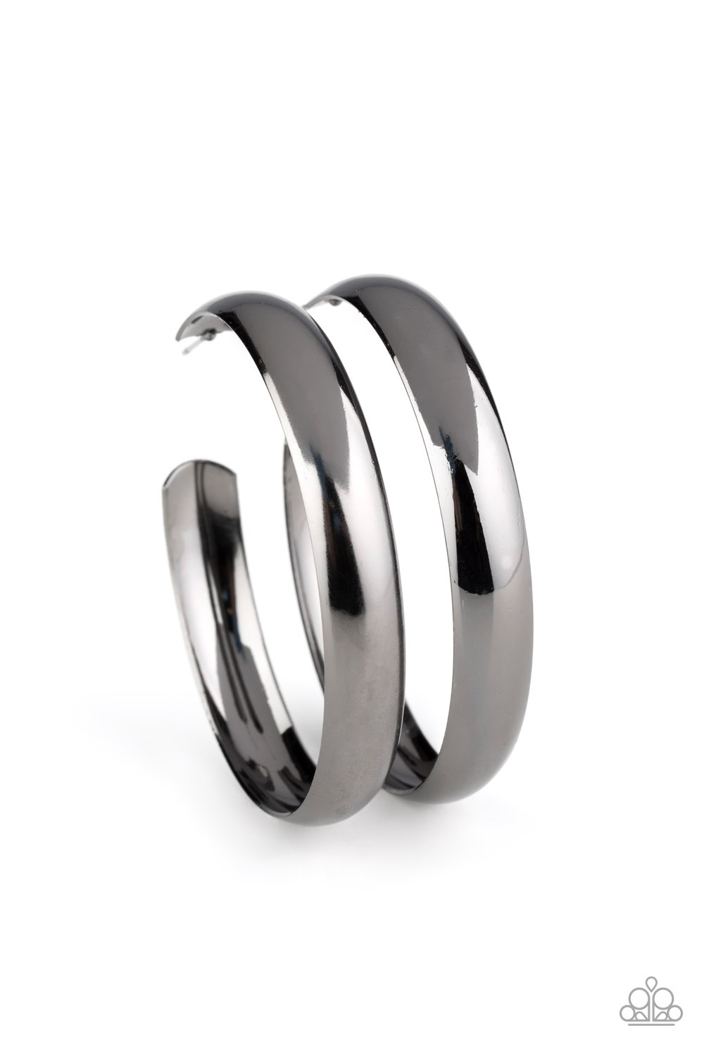 A flat gunmetal bar delicately curls into an oversized hoop for a bold industrial look. Earring attaches to a standard post fitting. Hoop measures approximately 2 1/4" in diameter.