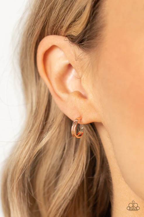 Two flat rose gold bars delicately curve into a single hoop, creating a dainty layered look. Earring attaches to a standard post fitting. Hoop measures approximately 1/2" in diameter.