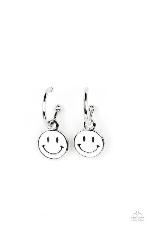 A small, skinny, silver hoop curves around the ear, where a silver ball is affixed to create the look of a barbell. A white disc slides along the hoop, cheerfully showcasing a silver smiley face that adorns its colorful surface. Earring attaches to a standard post fitting. Hoop measures approximately 1/2 in diameter.