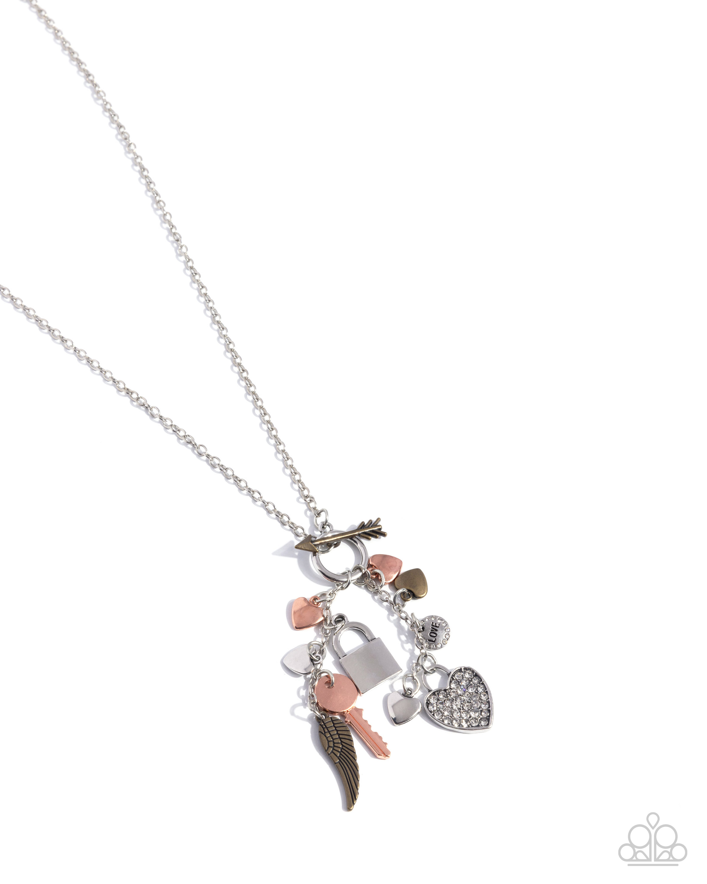 Featuring a romantic collection of sleek shiny copper, silver, and brass hearts, a shiny copper key, a brass half-angel wing, a silver padlock, a white rhinestone-dusted silver heart padlock, and a white rhinestone-bordered silver disc with the stamped word "LOVE" delicately cluster below an extended silver chain, swinging from the bottom of a sleek silver ring. A brass cupid's arrow is suspended above the fringe and through the sleek silver ring, adding a Cupid-inspired finish. Features a toggle clasp closure.