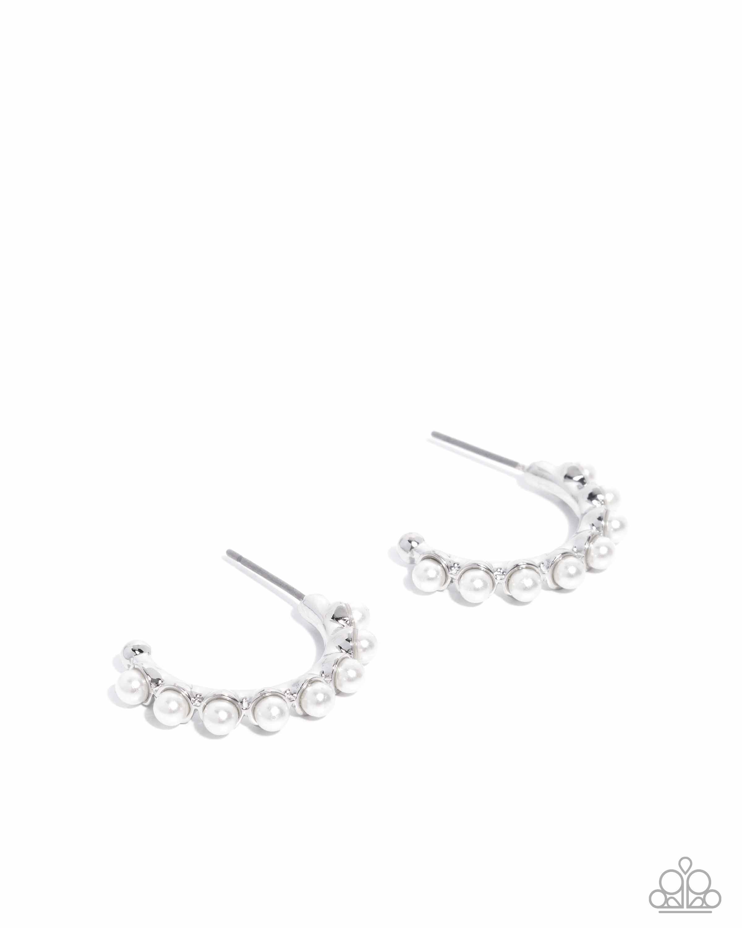 A classy collection of glossy dainty white pearls are elevated along the outside curve of a shiny, scalloped silver hoop for a positively posh finish. Earring attaches to a standard post fitting. Hoop measures approximately 1" in diameter.