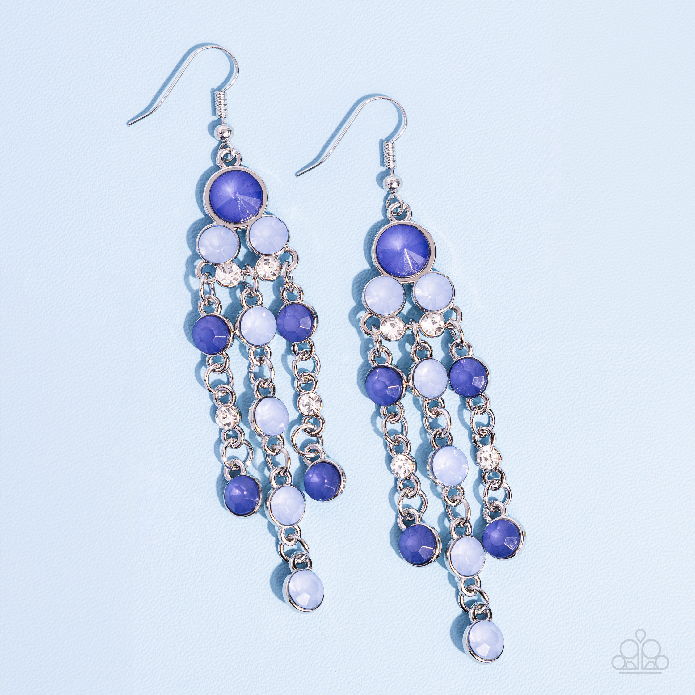 Featuring Marlin, Chambray Blue, and white rhinestones, a trio of silver chains sporadically dotted with the kaleidoscope of colors cascades in a tapered effect below the ear for an eye-catching whimsical sway. Earring attaches to a standard fishhook fitting.