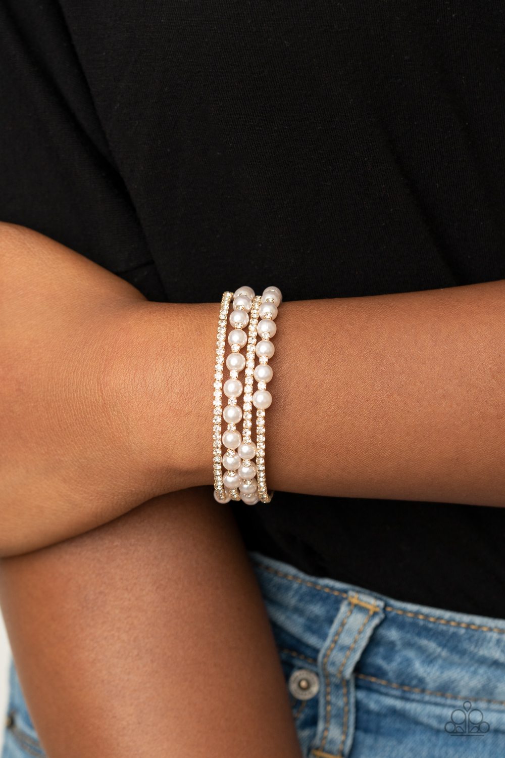 Row after row of glassy white rhinestones and classic pearls coil around the wrist, creating a blinding infinity wrap bracelet.
