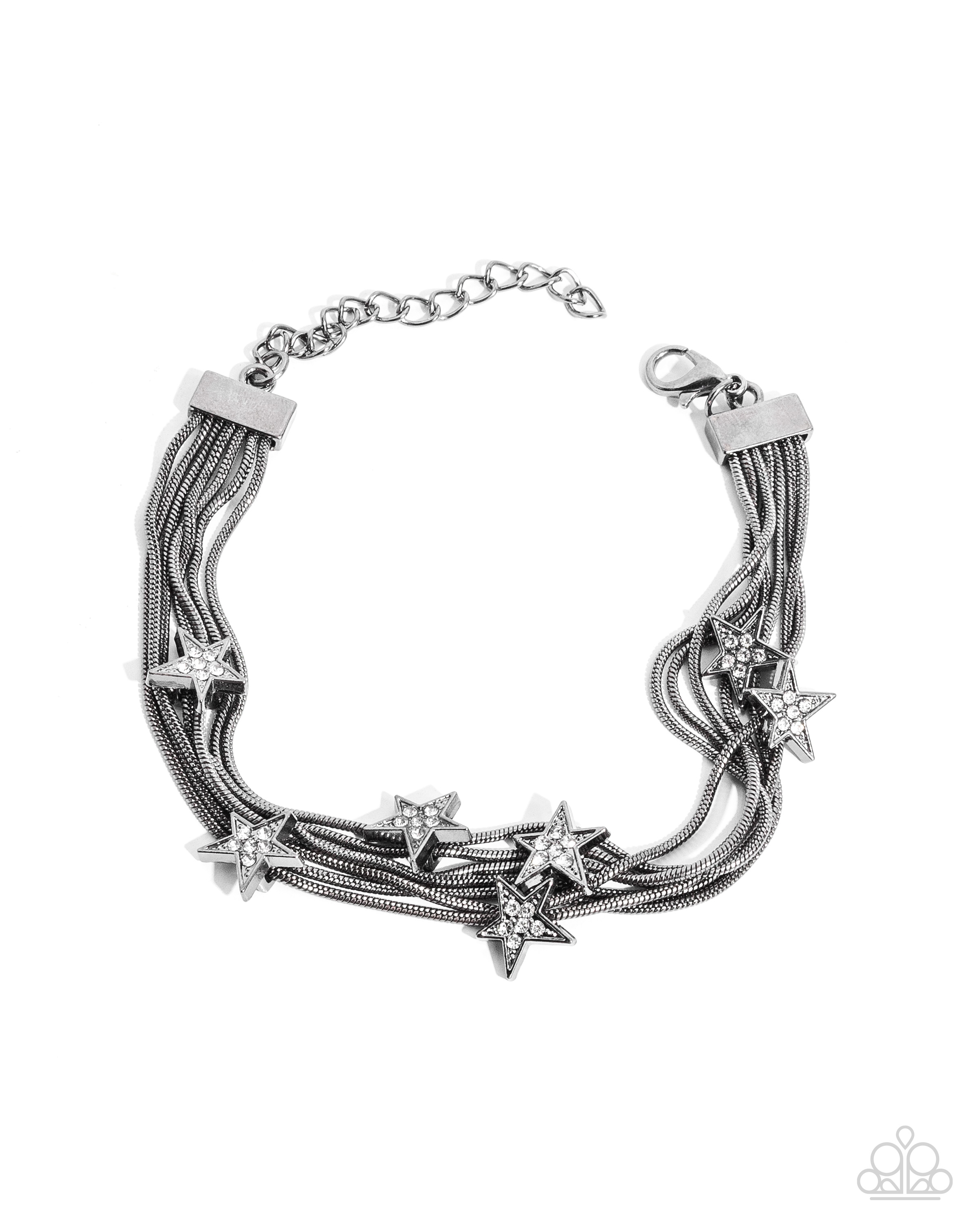 Embellished in white rhinestones and gunmetal studs, a collection of glistening gunmetal stars is infused along copious strands of gunmetal snake chains for a sassy stellar look along the wrist. Features an adjustable clasp closure.
