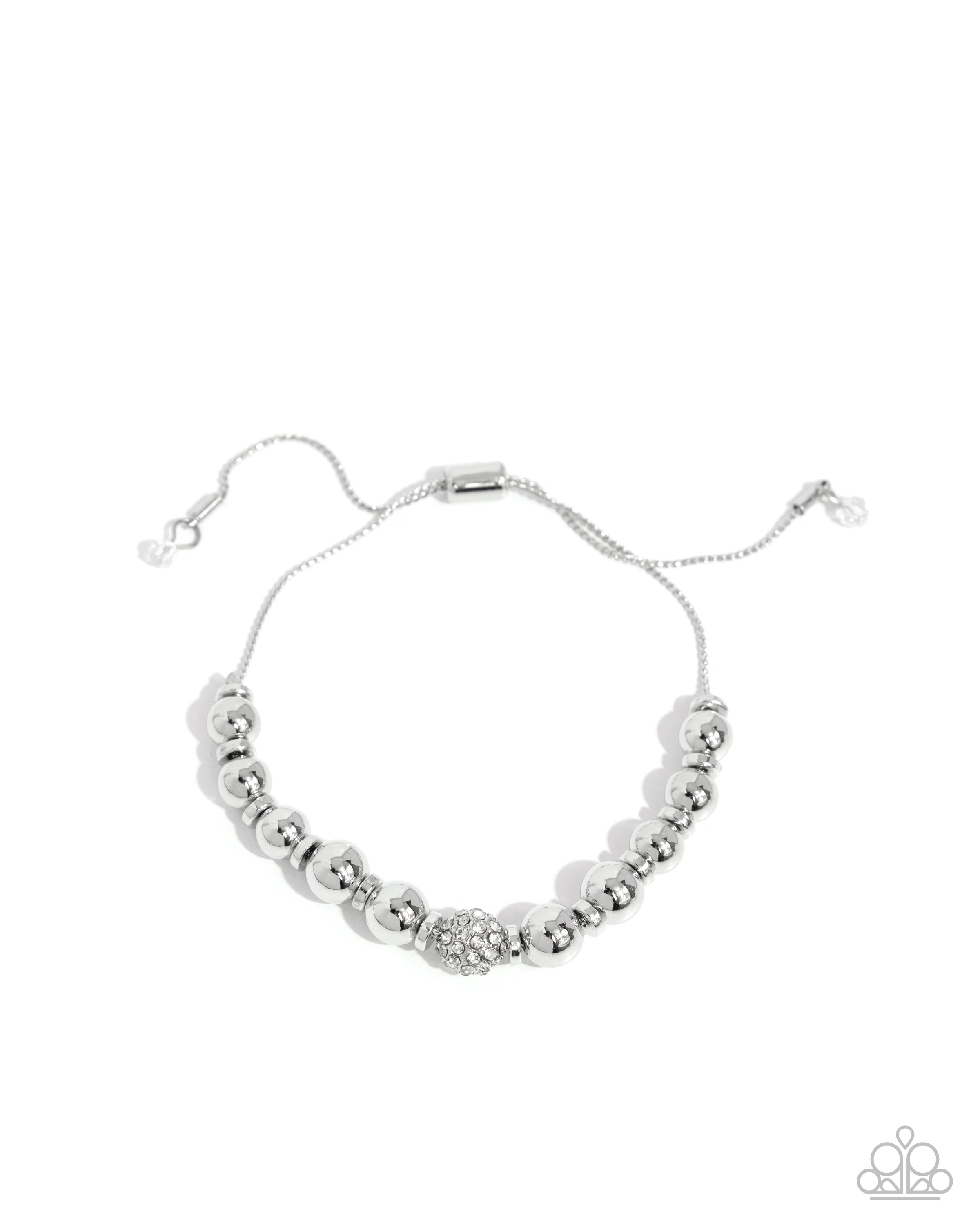 Infused along a dainty silver snake chain, a collection of high-sheen silver beads and discs alternate along the wrist, leading the eye to a white rhinestone-embellished silver ornament at the center of the display for a standout shimmer. Crystal-like white gems dot the ends of the snake chain for additional eye-catching detail. Features an adjustable sliding bead closure.